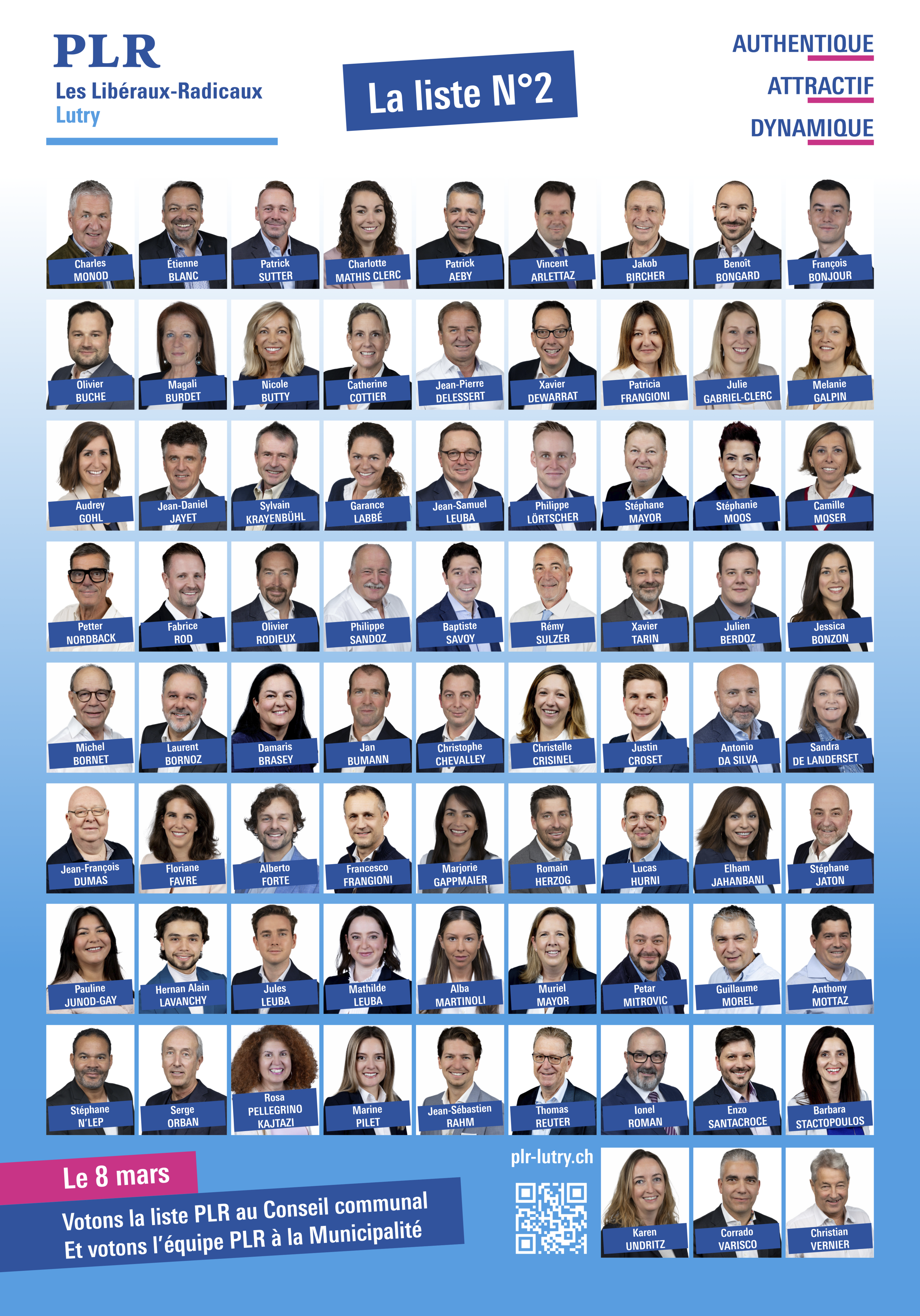 Au Conseil communal, le PLR vous présente une liste de 75 candidates et candidats, affichant une large diversité, mais une grande cohésion, et prêts à s'engager au service de leur commune !