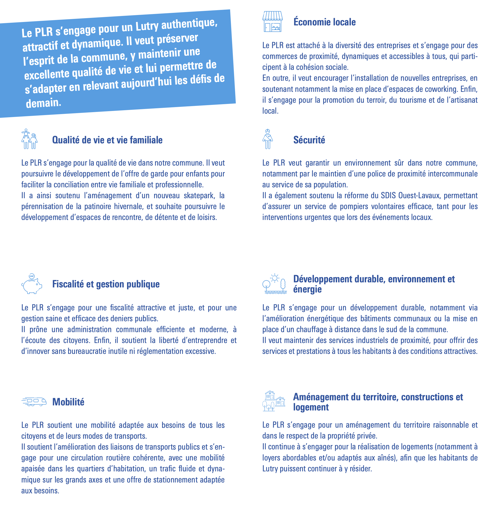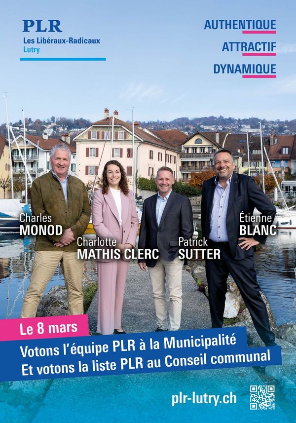 Le PLR s'engage pour un Lutry authentique, attractif et dynamique. Il veut préserver l'esprit de la commune, y maintenir une excellente qualité de vie et lui permettre de s'adapter en relevant aujourd'hui les défis de demain.